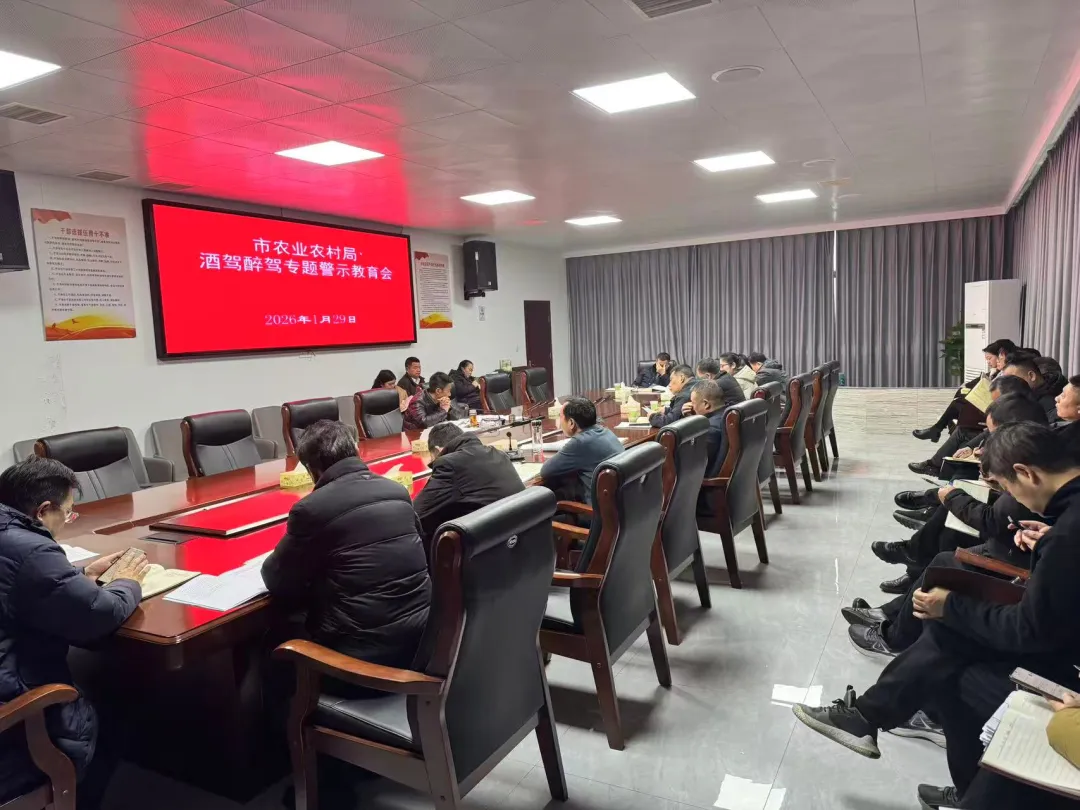 2026年1月29日下午,市农业农村局在局二楼会议室召开酒驾醉驾专题警示教育会,局领导班子成员、经管局、畜牧兽医服务中心、水产服务中心、农机发展中心班子成员、机关各股室负责人、局属各单位负责人等48人参加了会议。