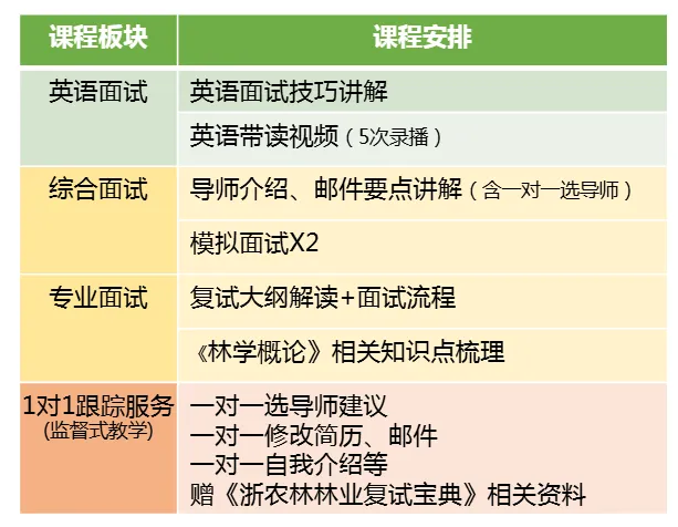 全方位的面试课程带你解析浙农林林业方向,带你了解导师(含修改简历、自我介绍)+传授面接技巧+解析专业面试内容(林学概论)+模拟面试,带你复试取得高分!