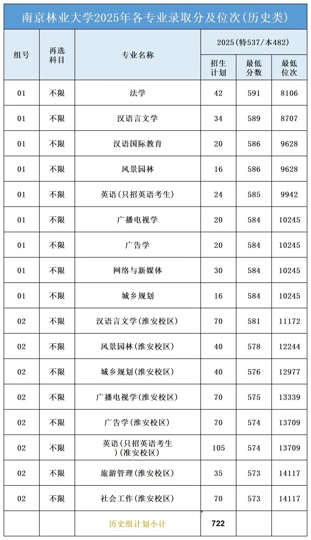 2025年南林历史类722个招生计划,投档最高分法学专业,591分,最低位次8106;投档最低分社会工作(淮安校区)573分,最低位次14117。