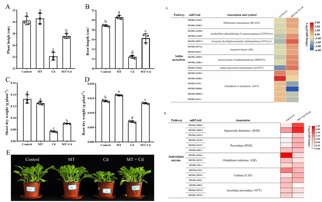 结果表明,MT通过重建氧化还原稳态和调控硫代谢增强芥菜对Cd的耐受型。外源MT处理显著提高了抗氧化酶(超氧化物歧化酶、过氧化物酶、过氧化氢酶和抗坏血酸过氧化物酶)活性和非酶抗氧化剂(谷胱甘肽、谷胱甘肽二硫、抗坏血酸和脱氢抗坏血酸)的合成,维持了光合色素(叶绿素a、叶绿素b、总叶绿素和类胡萝卜素)水平和净光合速率。降低幼苗体内活性氧和丙二醛含量,影响谷胱甘肽s -转移酶活性、半胱氨酸和硫代葡萄糖苷含量以及硫代谢相关基因BCAT4、CYP83A1和ST5a-b-c的表达,从而保护细胞免受损伤,提高芥菜抵御Cd胁迫的能力。