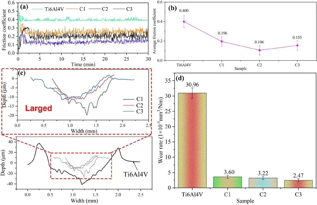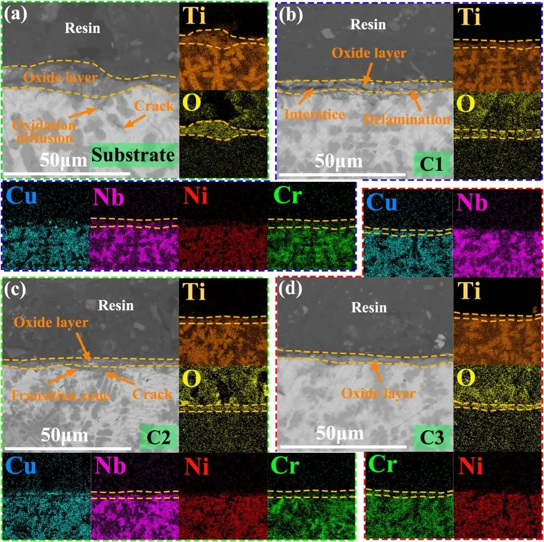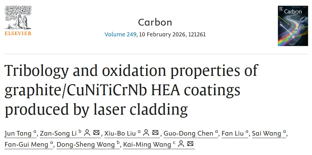 在航空航天与高端装备制造领域,Ti6Al4V 钛合金因其高比强度和耐蚀性被广泛应用,但在高温摩擦与氧化环境下易发生表面磨损与失效,已成为制约服役寿命与可靠性的关键瓶颈。传统表面强化方法往往在“硬度—韧性”之间难以兼顾,单纯提升硬度易诱发脆性剥落,而引入软相虽能缓解开裂,却可能削弱高温耐磨与抗氧化性能。针对这一工程痛点,《Tribology and oxidation properties of Graphite/CuNiTiCrNb HEA coatings produced by laser cladding》通过激光熔覆技术在 Ti6Al4V 表面构建石墨增强的 CuNiTiCrNb 高熵合金涂层,利用石墨在高温熔池中的分解与原位反应行为,诱导形成TiC、NbC、Cr₃C₂ 及 Ti₂AlC/Ti₃AlC等多尺度强化相,并协同构建致密氧化膜与自润滑界面结构,实现了耐磨与抗氧化性能的同步提升。研究结果表明,在600 °C工况下,该复合涂层的摩擦系数与磨损率显著降低,同时形成以 Cr₂O₃/TiO₂为主的稳定氧化层,有效抑制氧扩散与基体劣化,为高温构件的长寿命服役与再制造提供了一种兼具力学强化与界面调控的新思路。