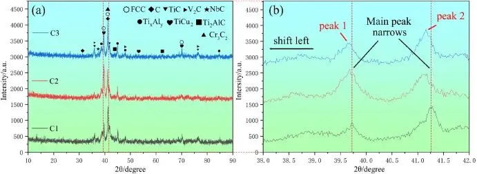 图1. 不同石墨含量高熵合金涂层的XRD图谱