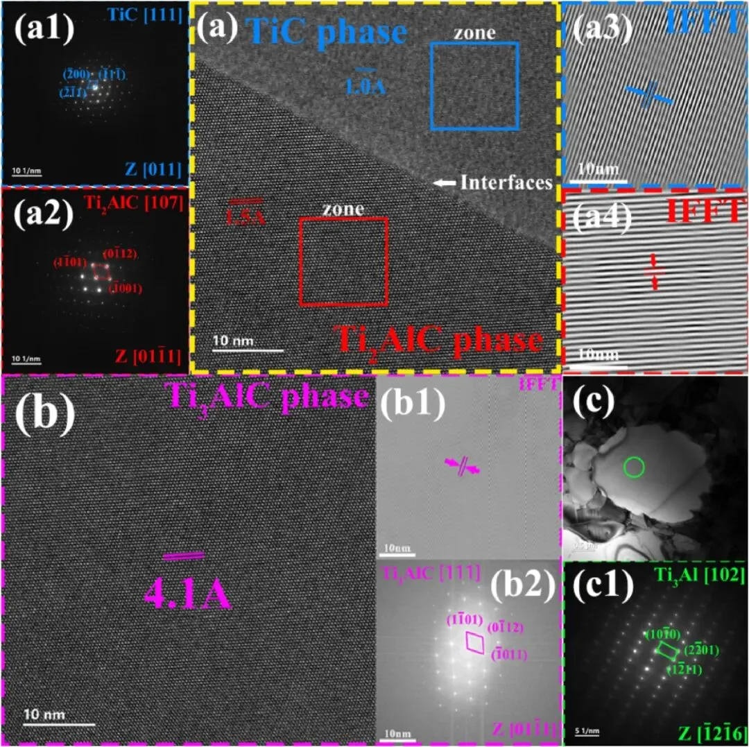 图2. 不同石墨含量高熵合金涂层的显微组织与元素分布图3. (a) TiC、Ti₂AlC和Ti₃AlC相的扫描电子能损谱及其对应的逆快速傅里叶变换与快速傅里叶变换图像;(b) 界面区域的高分辨率透射电镜图像及其对应的扫描电子能损谱图像。