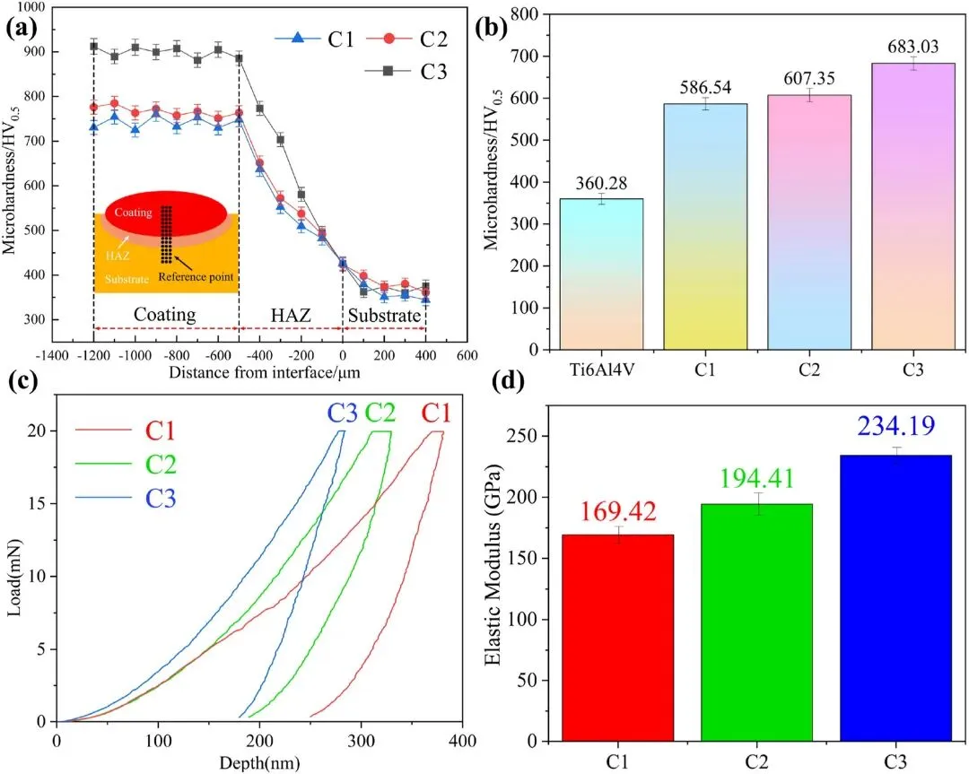 该研究针对钛合金在高温摩擦与氧化环境中易发生失效的问题,通过激光熔覆技术在Ti6Al4V表面构建石墨增强的CuNiTiCrNb高熵合金涂层,实现了材料设计层面的突破。石墨在高温熔池中分解为活性碳原子,与Ti、Nb、Cr等强碳化物形成元素反应,原位生成TiC、NbC、Cr₃C₂及层状Ti₂AlC/Ti₃AlC等多尺度强化相。这些硬质相在组织中呈弥散分布,可有效阻碍位错运动、细化晶粒结构,从而显著提高涂层硬度与承载能力。同时,部分残余石墨以层状结构保留于涂层中,为后续摩擦过程提供自润滑潜力。该复合结构兼顾“硬质增强”和“柔性调控”,在材料体系层面突破了传统耐磨涂层中硬度与韧性难以兼顾的瓶颈,为高温工况下金属表面强化提供了一种兼具结构稳定性与功能调控的新策略。