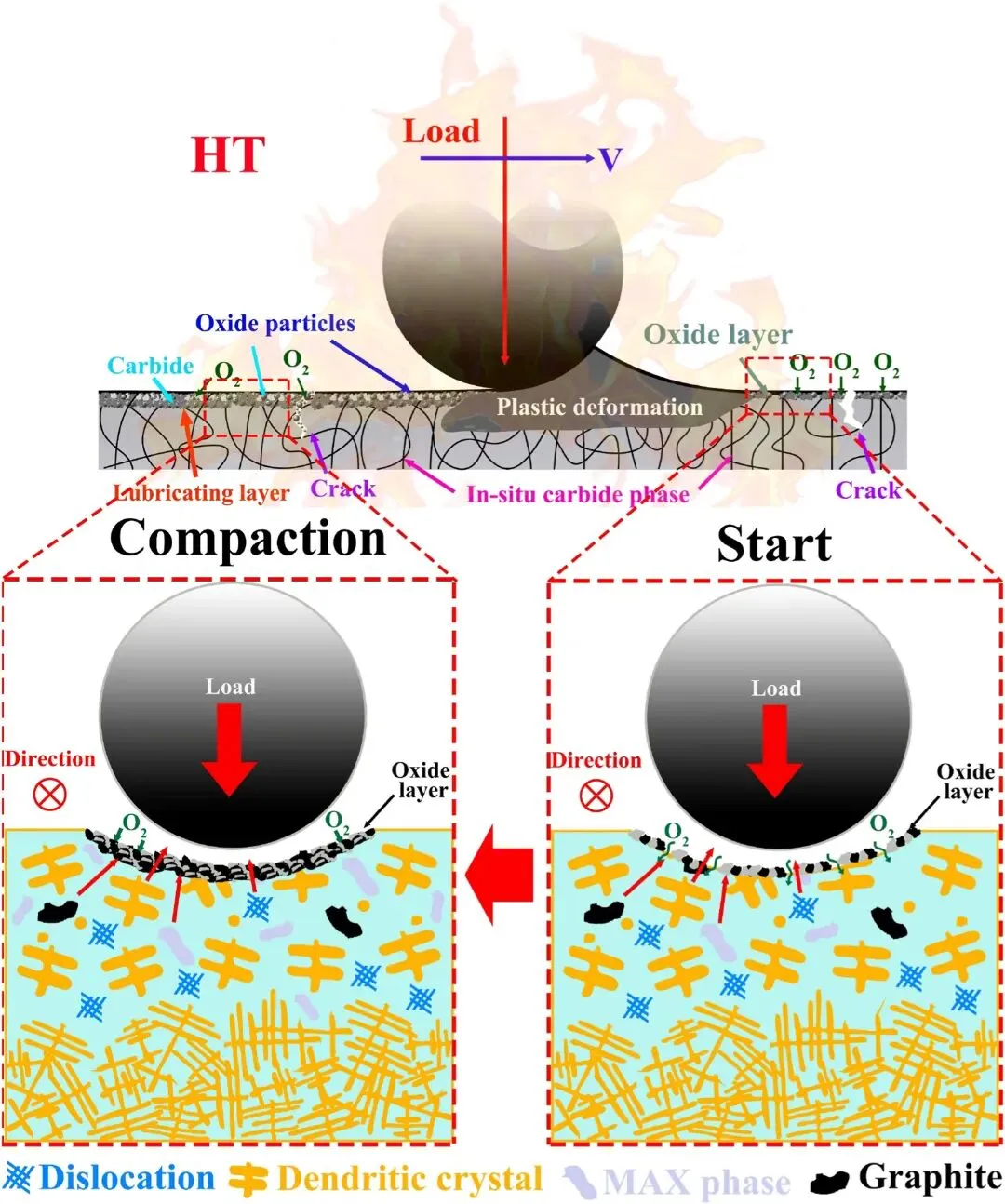 在600 °C高温摩擦条件下,石墨增强高熵合金涂层表现出优异的减摩抗磨性能。研究发现,随着石墨含量的增加,涂层摩擦系数和磨损率显著下降,其主要原因在于摩擦过程中形成了由残余石墨、Ti₂AlC/Ti₃AlC相及金属氧化物构成的复合润滑层。石墨的层状结构在剪切作用下易于滑移,能够降低界面剪切应力,而硬质碳化物相则为表面提供有效支撑,减少塑性变形与犁削磨损。同时,高温环境下生成的氧化物颗粒在反复压实作用下形成“第三体层”,在摩擦副之间分担载荷、减缓直接金属接触。该研究揭示了“硬质相承载—润滑相减摩—氧化层保护”三者之间的协同机制,表明通过微观组织设计可以实现摩擦界面行为的主动调控,从而显著延长材料在极端服役条件下的使用寿命。