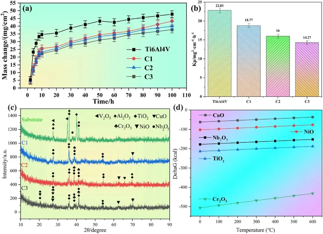 图7. (a) 氧化动力学曲线;(b) Kp值;(c) 高温氧化后涂层表面的XRD图谱;(d) 各氧化物的ΔG值。