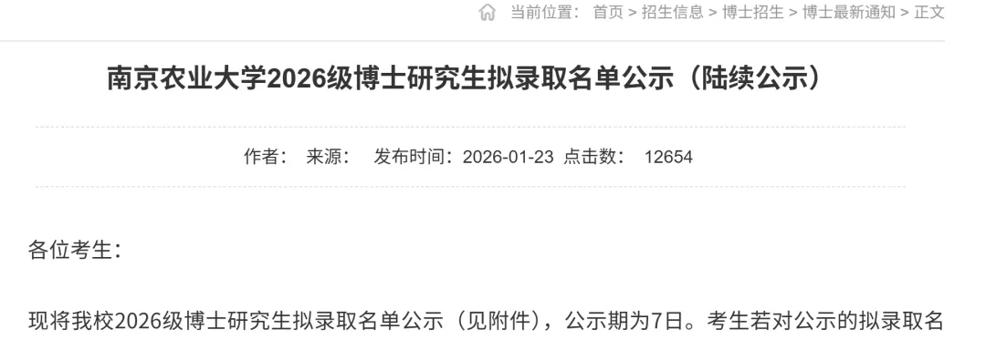 现将我校2026级博士研究生拟录取名单公示(见附件),公示期为7日。考生若对公示的拟录取名单有异议,请在公示期内与相关学院联系,或与我校研究生招生办公室联系。本名单为待上报教育部审核的拟录取名单,最终名单以教育部审核结果为准。凡发现弄虚作假者,将取消录取资格。