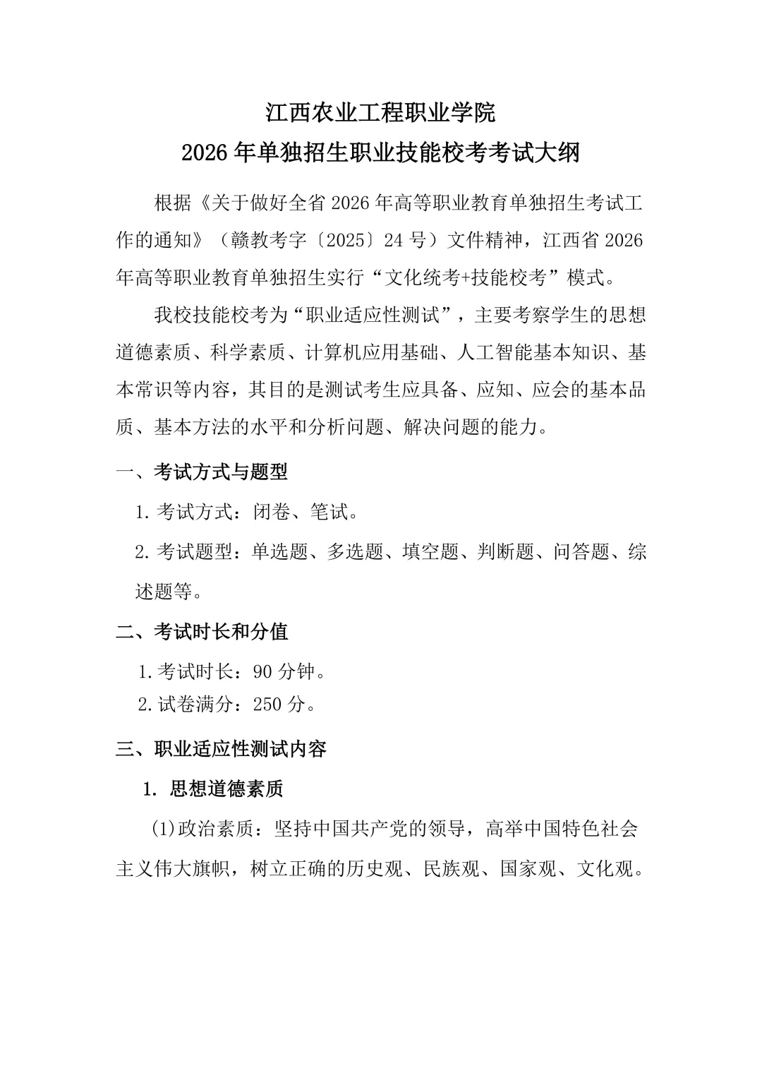 >2026年江西农业工程职业学院单招大纲及样卷