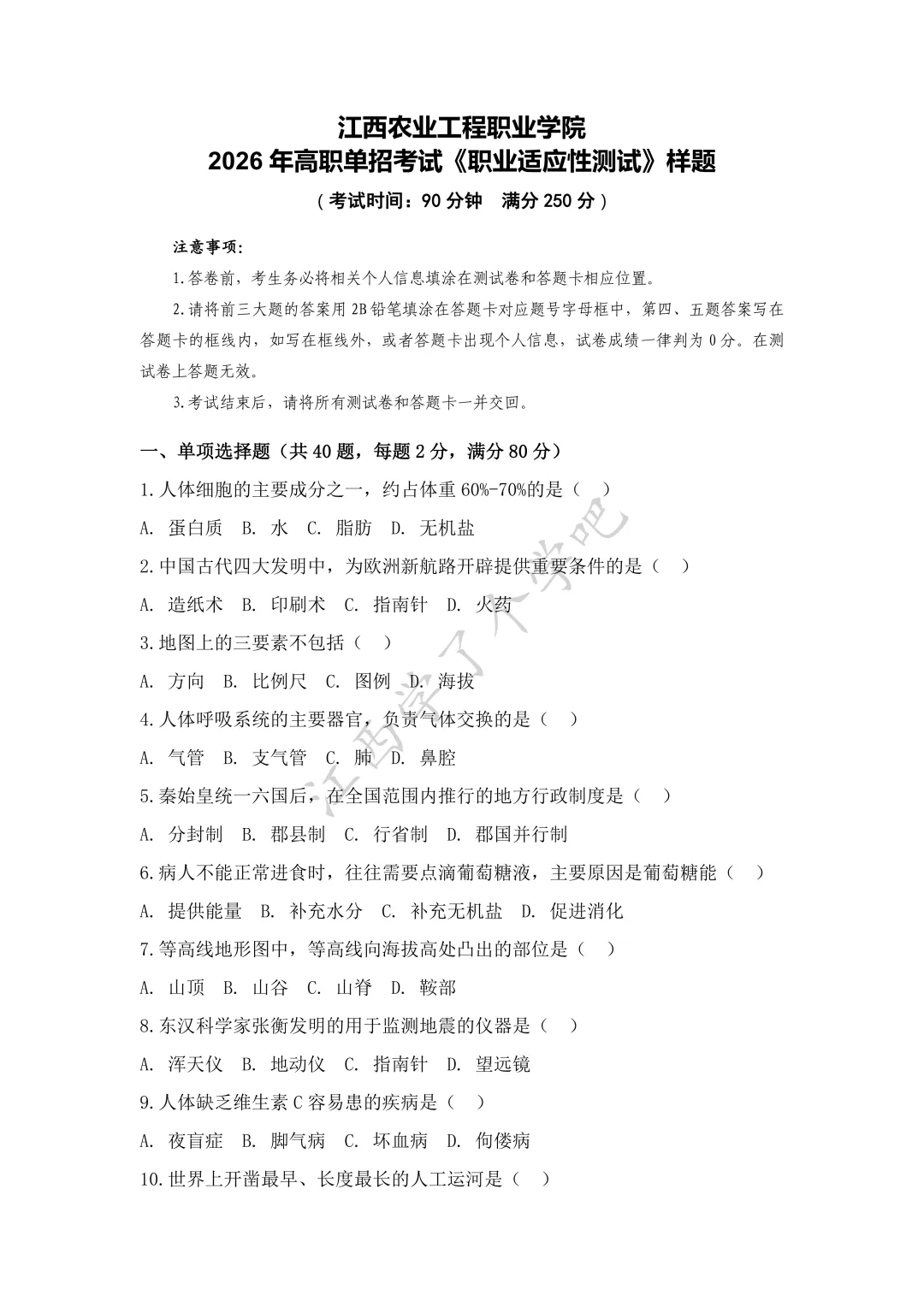 2026年江西农业工程职业学院单招大纲及样卷