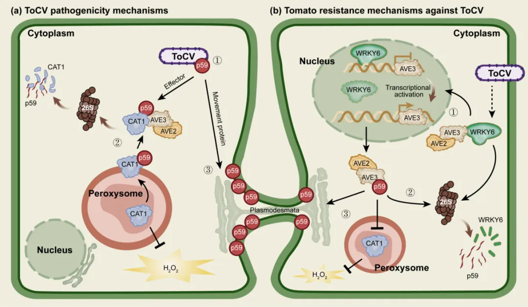 全球番茄年产量超过1.8亿吨,但长期遭受各类病毒病的危害,严重时减产70%以上,乃至绝收。其中,番茄褪绿病毒(ToCV)更是令人头疼的“顽疾”,至今尚未在野生及栽培种中鉴定出完全免疫ToCV的番茄种质。近日,山东农业大学巩彪、竺晓平、李宏博教授合作研究团队在Nature Communications发表了题为“Tomato antiviral ubiquitin-proteasome system recognizes viral 59 kDa protein to confer tomato chlorosis virus resistance”的研究论文,不仅揭示了番茄与ToCV之间延续千万年的“攻防策略”,还解析了番茄胞内识别ToCV蛋白质元件的分子机制,并从野生番茄中发掘了更为强效的“识别元件”,为培育高抗褪绿病毒的番茄新品种提供了关键候选基因与理论基础。ToCV之所以防治困难,源于其进化出的一套精密入侵策略。研究表明,病毒基因组编码的59kDa蛋白(p59)是其中的关键致病因子,它就像一个“多面手”,在不同阶段发挥不同作用。首先,p59负责病毒自身的“形态组装”。如果缺少p59,病毒颗粒会出现结构异常,导致其感染力显著下降。其次,p59扮演“扩散推手”的角色。它能精准定位至番茄细胞间的连接通道——胞间连丝,通过减少细胞壁上的胼胝质沉积,扩大通道口径,从而帮助病毒颗粒顺利向邻近细胞扩散,实现快速传播。而最令人警惕的,是p59的“伪装与劫持”能力。它能伪装成植物的正常蛋白,并靶向番茄的过氧化氢酶(SlCAT1)。这种酶原本是细胞的“抗氧化卫士”,负责清除过氧化氢(H₂O₂),维持细胞内氧化还原平衡。p59通过改变SlCAT1的亚细胞定位,将其从过氧化物酶体“挟持”至细胞质中,并利用番茄自身的泛素-蛋白酶体系统(UPS)将其降解。一旦失去SlCAT1的保护,番茄细胞内H₂O₂大量积累,引发氧化应激,细胞环境反而更利于病毒复制与传播,从而加速病害发展。面对病毒的步步紧逼,番茄也进化出了一套高效的“防御体系”,其核心正是UPS。这个系统就像番茄细胞内的“特种部队”,能精准识别并降解外来入侵蛋白。研究团队发现,番茄中的E3泛素连接酶SlAVE3是防御系统的“核心探测器”。它能特异性识别病毒的p59蛋白,通过与E2泛素结合酶SlAVE2协作,启动泛素化修饰过程——给p59打上“降解标签”,随后被26S蛋白酶体识别并摧毁。这个过程就像给病毒蛋白贴上“危险垃圾标签”,让细胞的“蛋白回收系统”将其快速清除。更巧妙的是,番茄还进化出了“正反馈调节”机制,让防御反应逐级放大。SlWRKY6是一个抑制SlAVE3表达的转录因子,平时会限制防御系统的过度激活。当病毒入侵时,SlAVE2-SlAVE3复合物会先降解SlWRKY6,解除其对SlAVE3的抑制,让SlAVE3大量表达,形成“越有病毒,防御越强”的良性循环,快速集结力量对抗入侵。这种防御机制实现了双重效果:既直接降解病毒的关键蛋白p59,阻止病毒组装和扩散;又减少了p59对SlCAT1的劫持,维持细胞内的氧化还原平衡,从根源上抑制病毒繁殖。在研究过程中,科学家们还有一个意外发现:现代栽培番茄的抗病能力,竟然不如它的“祖先”——野生番茄S. pimpinellifolium。通过对652份番茄材料的基因组分析,研究团队发现,SlAVE3基因所在的区域是番茄驯化过程中的“选择热点”。野生番茄的SpAVE3基因与现代栽培番茄的SlAVE3基因存在两个关键的氨基酸差异。正是这两个微小的差异,让SpAVE3拥有了更强大的抗病能力。实验证明,SpAVE3对病毒p59的结合亲和力是SlAVE3的9倍多,能更高效地识别并降解p59;同时,它与SlCAT1的结合能力却显著减弱,减少了对自身“抗氧化卫士”的误伤。将SpAVE3导入现代栽培番茄后,植株的ToCV抗病性大幅提升,病害症状明显减轻,病毒积累量显著下降。这一发现揭示了一个重要现象:番茄在驯化过程中,为了追求更大的果实、更高的产量,可能无意中牺牲了部分抗病基因及其单倍型。而野生番茄在严酷的自然环境中,保留了这些珍贵的抗病遗传变异。从野生番茄到栽培品种,从病毒入侵到植物防御,这场跨越千万年的“攻防大战”,最终在科学家的实验室里找到了破解之道。这不仅是基础研究的重大突破,更是科技赋能农业的生动例证。相信在不久的将来,随着这些研究成果的落地转化,我们将看到更多抗病、高产、优质的番茄品种走进田间地头,为农业可持续发展注入新的活力。团队合影(第一作者赵丹博士,一排左4;通讯作者巩彪教授,一排左5)https://doi.org/10.1038/s41467-026-68832-3