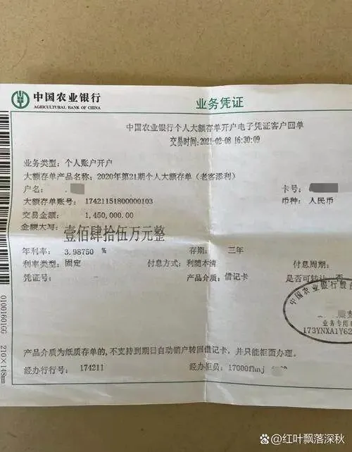 还有个细节很多人不清楚。农行的大额存单起存金额就是20万,低于这个数只能存普通定期,利率还要再打折扣。但各地分行为了完成存款任务,有时候会搞一些”拼单”的操作。比如你和家里人凑够40万,分别办两张存单,有些网点睁一只眼闭一只眼就给办了。我那个老同事说,这种操作得看具体支行,有的行长松点就行,有的严格起来一点通融都没有。