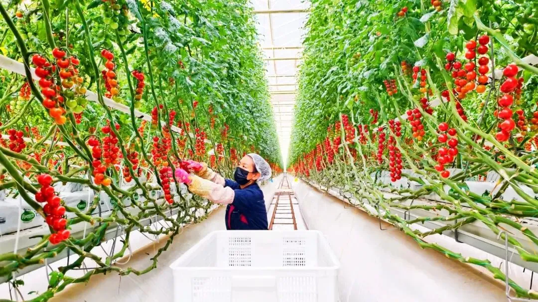 走进古浪县越海农业现代智能温室,澄澈的阳光透过屋顶倾洒而入,一串串鲜红的番茄缀满枝头,长势喜人。技术人员穿梭在番茄种植架间,细致察看番茄长势;工人们各司其职,或乘升降平台车为番茄打杈、疏花,或推着采摘车沿着轨道采收鲜果,一派繁忙有序的现代农业生产图景跃然眼前。