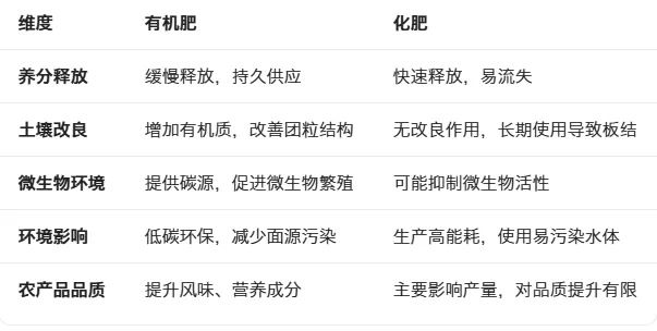 如果把土壤比作一个社区,化肥就像是给居民直接发钱——短期内大家很开心,但社区基础设施没有改善。有机肥则是投资修建公园、图书馆、健身房——虽然见效慢一些,但整个社区的品质和可持续性都提升了。