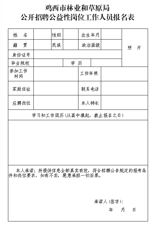 鸡西市辖区城镇户籍,在法定劳动年龄内,已登记失业或符合登记失业条件,并符合就业困难人员认定条件的有就业愿望和就业能力的未就业人员。1.名下有营业执照或担任企业法人、股东、高管、监事等职务的;1.拥护《中华人民共和国宪法》,具有良好的思想政治素质,遵纪守法,诚实守信,品行端正。2.中专(高中)及以上学历,40周岁以下,会熟练使用电脑常用办公软件。本人持一寸照片(近期免冠蓝底彩色照片2张)。个人简历、户口本(首页及本人页)、身份证(正反面)、毕业证、就业创业证(就业失业登记证)及就业困难人员认定材料(证明本人近一年内不存在单位社保缴费、缴纳公积金,以及工商注册登记、有营运车辆、门市房等情况)以上所有材料原件、复印件,到西山路80号鸡西市林业和草原局307室填写报名表。材料不全者不能参加下一招聘环节。采取面试的方式,按照成绩由高到低的方式公平公正开展招录。聘任后,按照公益性岗位人员管理,按规定缴纳社会保险。