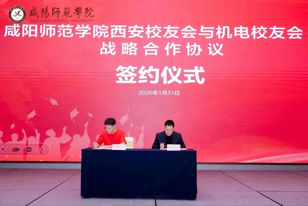 会后,全体参会人员移步三楼宴会厅,参加由咸阳师范学院西安校友会和机电校友会联合举办的咸阳师范学院校友年会,西安校友会会长王彪与机电校校友会会长郭耀利签署战略合作协议。