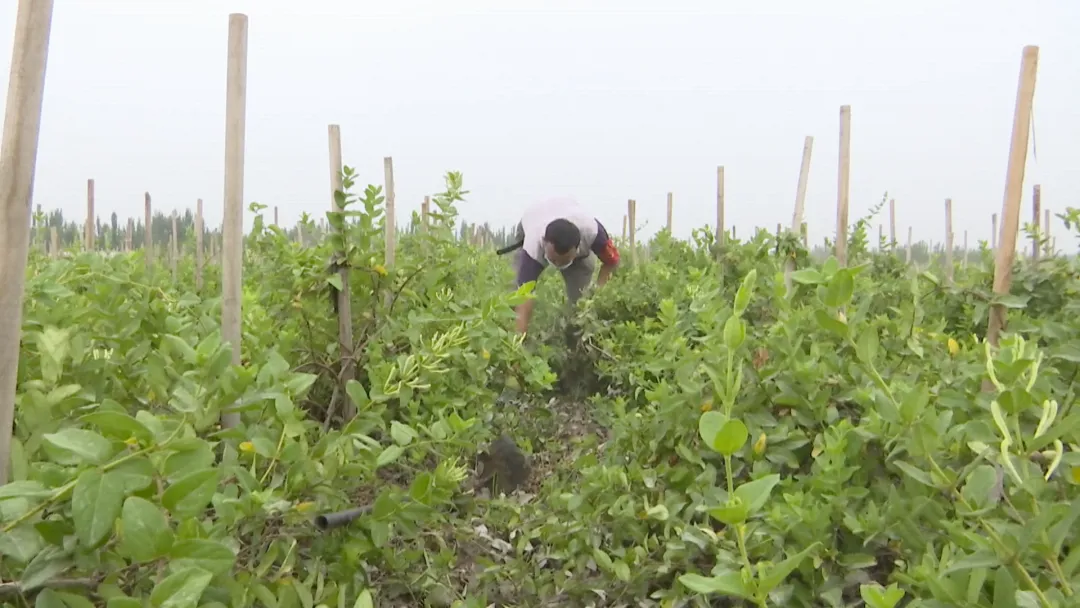 岳普湖县也克先拜巴扎镇吐格曼艾日克村村民吐尔逊·吾斯曼说:“我有5亩金银花,前两次开花期卖出了9000-10000元的金银花,前期因为居家防疫,金银花地长了些野草,现在在村委会的组织下,在除草并修剪金银花。”