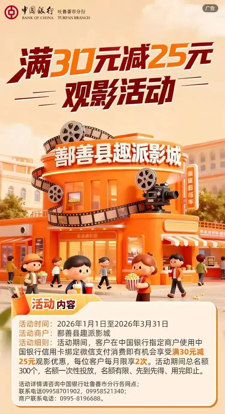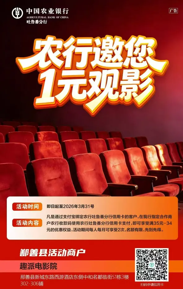 活动内容:通过支付宝绑定农业银行信用卡的客户可参与趣派巨幕影城优惠观影活动,满35减34享受一元观影优惠活动,活动期间每人每月可享受两次,名额有限先到先得!