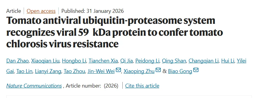 近日,山东农业大学巩彪、竺晓平、李宏博教授联合研究团队在《Nature Communications》发表了题为“Tomato antiviral ubiquitin-proteasome system recognizes viral 59 kDa protein to confer tomato chlorosis virus resistance”的研究论文,不仅揭示了番茄与ToCV之间延续千万年的“攻防策略”,还解析了番茄胞内识别ToCV蛋白质元件的分子机制,并从野生番茄中发掘了更为强效的“识别元件”,为培育高抗褪绿病毒的番茄新品种提供了关键候选基因与理论基础。