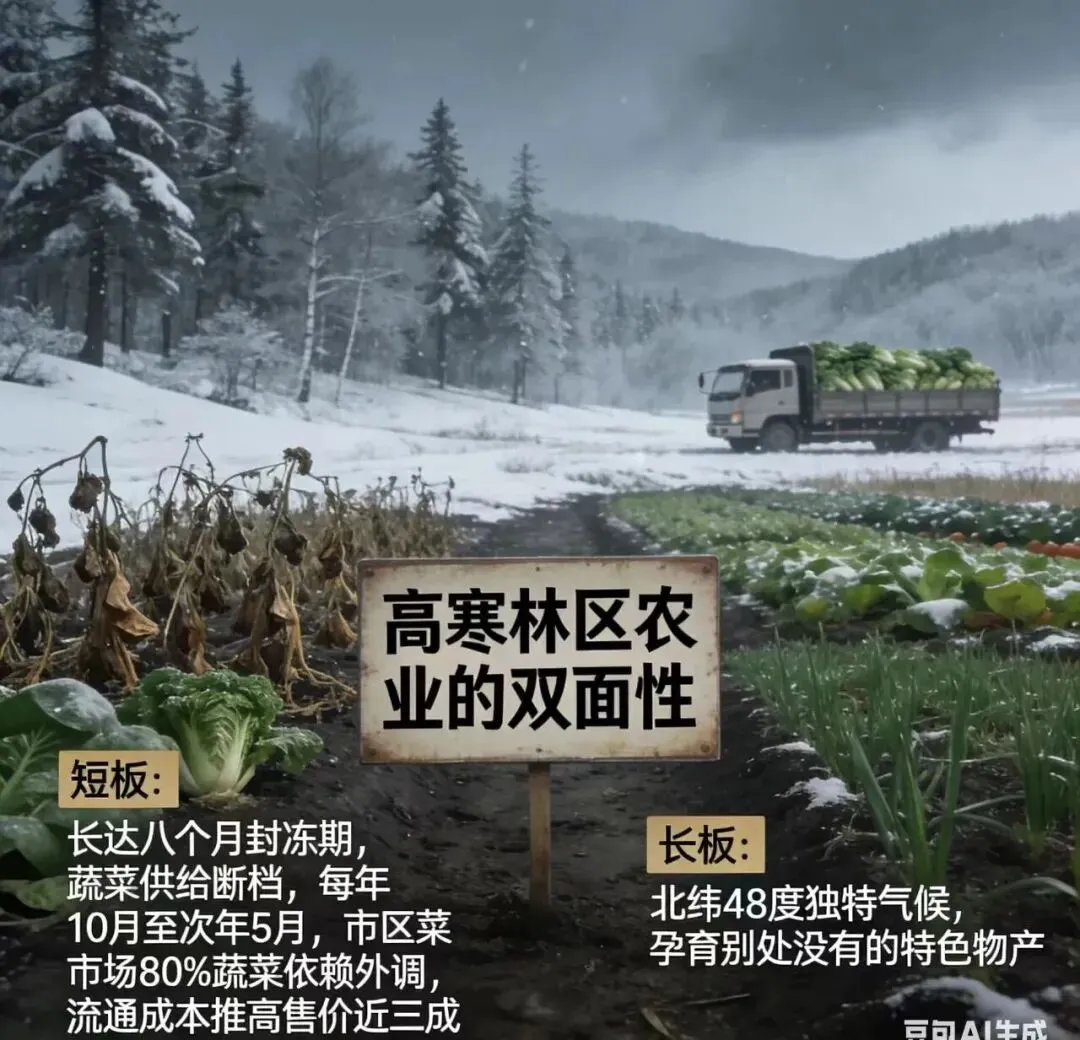那三个月,我带着团队走遍了友好区的沟沟坎坎,把过往十年的养殖产业数据翻了个底朝天。终于看清了高寒林区农业的“双面性”——“短板”与“长板”同在。短板是,长达八个月的封冻期导致蔬菜供给断档,每年10月至次年5月,市区菜市场80% 的蔬菜依赖外调,流通成本推高售价近三成;而长板即机遇恰恰藏在 “稀缺性”里——北纬48度的独特气候,能孕育出别处没有的特色物产。找准病灶后,我们定下了“反季突围 + 特色深耕”的双轨策略,要在这片黑土地上改写农业的 “季节规律”。