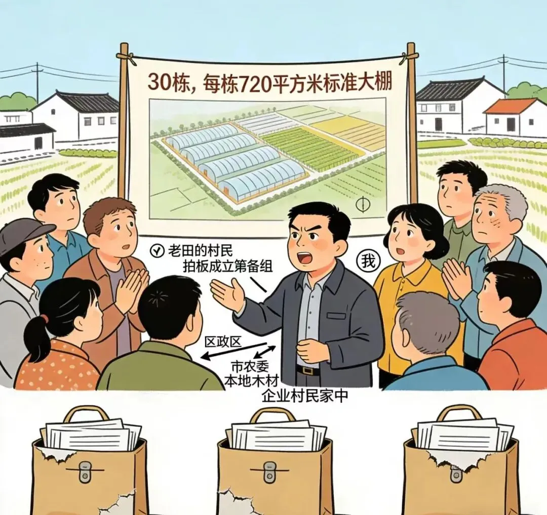 村民大会上,30栋每栋720平方米标准大棚的规划图刚挂出来,掌声未落,质疑声就冒了出来。90万元的总投资,村民自筹30万元后,剩下的60万像横在眼前的一座大山。老田当即拍板成立筹备组,我带着大家兵分四路:往区政府跑农业专项补贴,去市农委对接产业扶持资金,找本地木材企业谈冠名合作,挨家挨户做互助集资动员。那段日子,我们平均每天往返市区两三趟,三个装满申报材料的文件袋磨破了边角,终于在清明节前凑齐了所有资金。