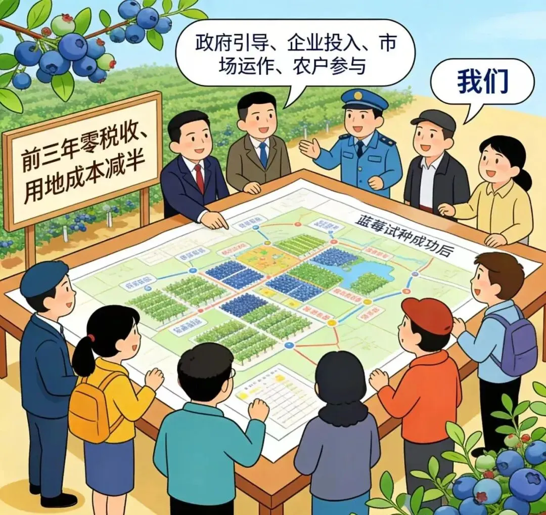 2011年春,100亩矮丛蓝莓试种启动。为保障成活率,我和技术人员住进园区板房,白天记录温度、湿度变化,晚上调试施肥配比,所有数据都精确到小数点后一位。那年秋天,95%的成活率远超预期的 85%,我们立刻启动规模化种植。结合市场调研,我们推出 “政府引导、企业投入、市场运作、农户参与”的模式,用 “前三年零税收、用地成本减半” 的政策吸引投资。很快,6家企业陆续入驻,其中一家带来了年产2000吨的果汁生产线,让蓝莓实现从鲜果到加工品的价值跃升。