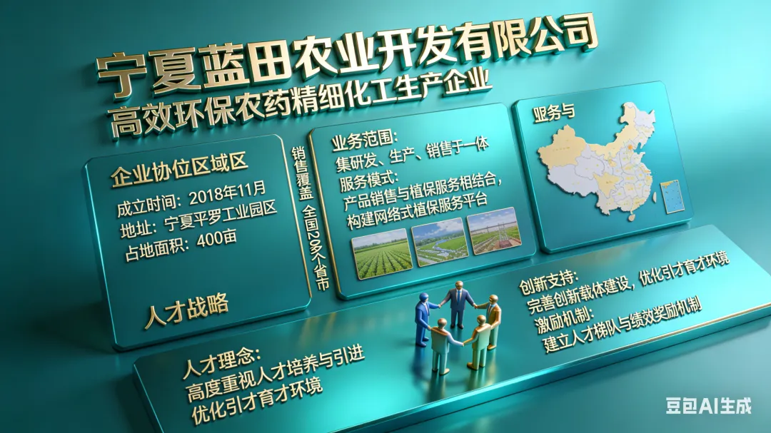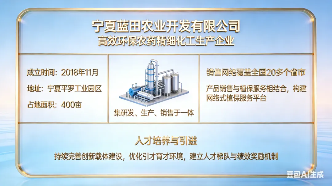 宁夏蓝田农业开发有限公司成立于2018年11月,位于宁夏平罗工业园区,占地面积 400亩,是一家集研发、生产、销售于一体的高效、环保型系列农药精细化工生产企业。公司坚持产品销售与植保服务相结合,构建网络式植保服务平台,销售网络覆盖全国 20多个省市。公司高度重视人才培养与引进,持续完善创新载体建设,优化引才育才环境,建立人才梯队与绩效奖励机制,为企业健康、绿色、高质量发展注入创新活力。
