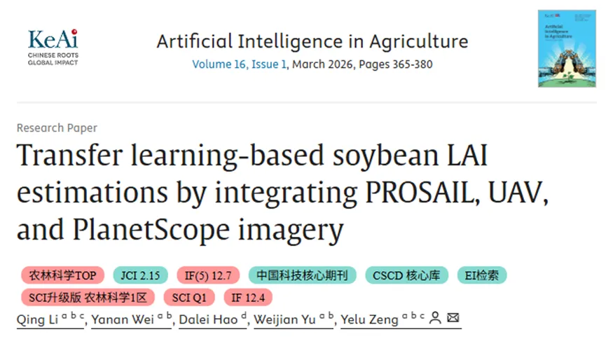 Transferlearning-basedsoybeanLAIestimationsbyintegratingPROSAIL,UAV,andPlanetScopeimagery,ArtificialIntelligenceinAgriculture,Volume16,Issue1,2026,Pages365-380,ISSN2589-7217,https://doi.org/10.1016/j.aiia.2025.10.018.