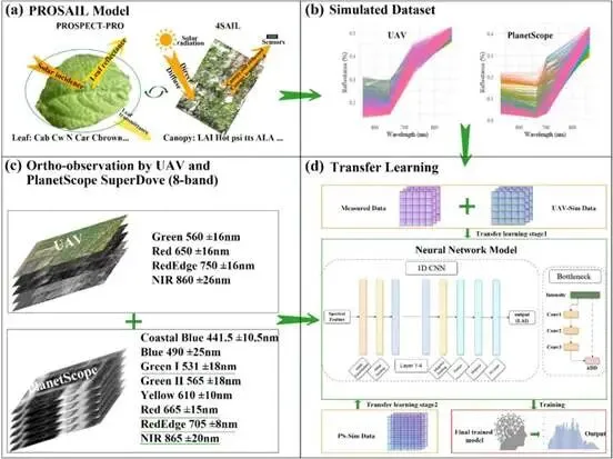 (1)提出LAI-TransNet两阶段迁移学习框架,先基于PROSAIL模拟数据与实测数据建立UAV尺度基准,再经跨域映射微调适配PlanetScope数据,解决跨尺度估算难题。
