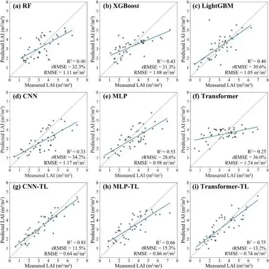 图3 使用UAV-Sim_Measured数据集不同模型间LAI预测表现的比较。散点图显示了预测与测量的LAI,分别针对(a)RF,(b)XGBoost,(c)LightGBM,(d)CNN,(e)MLP,(f)Transformer,(g)CNN-TL,(h)MLP-TL,以及(i)Transformer-TL。每个子图显示数据点、线性回归拟合(蓝线)、1:1参考线(灰虚线),并给出R2,RMSE(m2/m2),以及rRMSE(%)。