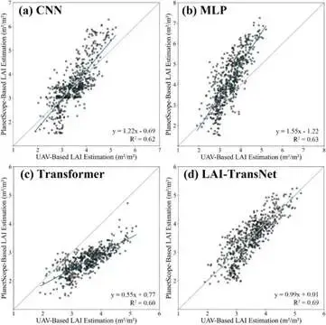 图4 四个深度学习模型基于PlanetScope的LAI估计与基于无人机的LAI估计(单位m2/m2)的散点图比较。(a)CNN,(b)MLP,(c)Transformer,(d)LAI-TransNet。每个子图包含一条蓝色回归线和一条灰色1:1参考线,以评估两个估计来源之间的一致性。