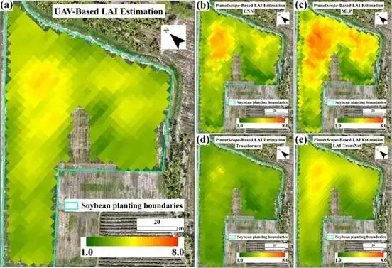 图6 基于不同数据源和模型的LAI空间分布图。(a)基于无人机的LAI参考图,采用最优模型生成,空间分辨率统一为3米。(b)-(e)基于PlanetScope的LAI分布图分别使用CNN、MLP、Transformer和LAI-TransNet模型生成。所有地图均标注大豆种植边界,并有一个统一的颜色条,范围从1.0米到8.0m2/m2表示标准化的LAI值,便于模型间空间分布差异的比较。