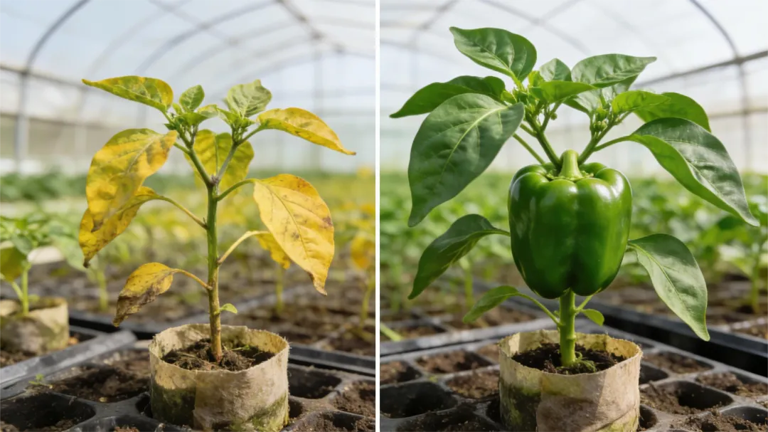 播种后把穴盘放到温暖的地方,保持温度28-30℃,湿度80-90%。这个阶段不需要光照,主要是保温保湿。一般4-6天就能出苗。出苗达到70%时要及时揭开覆盖物,让幼苗见光。如果不及时揭开,幼苗会徒长,形成高脚苗。出苗后温度要适当降低,避免徒长。白天保持在25-28℃,夜间15-18℃。温度过高苗子长得快但不壮,茎秆细弱,抗逆性差。温度过低生长缓慢,甚至停止生长。子叶展平后可以适当降温炼苗,白天23-25℃,夜间13-15℃。适当的低温锻炼能让苗子更健壮,抗逆性更强。但温度不能低于10℃,否则会造成冷害。水分管理要遵循"见干见湿、干湿交替"的原则。苗小时少浇水,保持基质湿润即可。子叶展平后适当控水,促进根系下扎。真叶展开后逐渐增加浇水量,但不能让基质过湿。浇水时间选择晴天上午,避免下午或傍晚浇水。浇水后要加强通风,降低空气湿度,避免发生猝倒病、立枯病等苗期病害。彩椒是喜光作物,苗期也需要充足的光照。光照充足时,叶片厚、颜色深、茎秆粗壮。光照不足时,叶片薄、颜色浅、茎秆细长、容易徒长。冬春季节育苗,如果遇到连续阴天,要想办法补光。可以安装LED补光灯,每天补光4-6小时。也要注意清理棚膜上的灰尘,提高透光率。根系是植株的基础,根深才能叶茂 。彩椒根系本来就不发达,如果苗期根系再培育不好,定植后缓苗慢、长势弱,整个生长期都会受影响。这个阶段 甄生根 的作用非常关键。甄生根采用中药萃取物与天然植物源活性成分,不含激素,安全高效,可被根系快速吸收利用。它的独特之处在于"智能促根"科技——不仅能快速激发新根萌发,更能智能调节根系生长节奏,使作物形成"黄金根群比例"(主根粗壮+侧根密集+根毛旺盛)。相比普通生根剂,甄生根可使根系有效吸收面积提升3倍以上。而且它独创的"根系活力保鲜技术"能延长根系功能期15-20天,真正实现"前期爆发式生根,后期持久性养根"。使用方法 :子叶展开后,用甄生根稀释800倍液灌根,每株50-80毫升。间隔7-10天再灌一次。两次灌根之后,效果非常明显:主根明显增粗,侧根数量成倍增加,根系颜色白亮、活力强。而且甄生根里的红景天成分能提高幼苗抗逆性,氨基酸能提供营养,一举多得。特别要说的是,甄生根既可以冲施也可以喷施。冲施能促进根系发育,喷施能增强植株免疫力、减少虫病害、促进花芽分化、提高坐果率。后期使用还能保花保果、加速果实膨大、改善果实色泽与口感。如果是整体发黄,可能是光照不足或温度过低;如果是新叶发黄、叶脉还是绿的,可能是缺铁;如果是老叶从边缘开始发黄,可能是缺镁;如果是生长点附近叶片发黄,可能是缺硼或缺钙。遇到黄化苗, 叶绿素 能快速解决问题。这个产品依托特定酶解生物技术,科学复配生物高活性有机微分子肽、有机螯合纳米钛、离子催化酶、高利用率螯合微量元素、天然生物刺激素。它以高活性、低用量、快吸收、速见效、长持效为显著优势,精准攻克作物因缺素、生理异常导致的黄叶、黄化、白叶等生长难题,快速矫正恢复健康长势。作用于作物生理层面,可加速叶绿素合成,使叶片浓绿增厚,强化光合效能。使用方法 :一袋兑一桶水,经二次稀释后叶面均匀喷雾。一般喷施后3-5天,黄叶情况就会明显改善,叶色转绿,叶片增厚。如果黄化严重,可以间隔5-7天再喷一次。如果采用苗床育苗或者播种过密,需要进行分苗。分苗一般在2-3片真叶时进行。分苗时要注意保护根系,尽量多带土。分苗后浇透水,遮阴2-3天,然后逐渐见光。穴盘育苗一般不需要分苗,但如果苗期过长,穴盘空间不够,可以进行假植。把苗从穴盘移到营养钵或更大的容器,给根系更大的生长空间。定植前7-10天要进行炼苗。逐渐降低温度,减少浇水,增加通风,让幼苗适应定植后的环境。炼苗做得好,定植后缓苗快,成活率高。炼苗期间白天温度控制在20-23℃,夜间13-15℃。浇水间隔延长,让基质表面发白再浇水。通风时间逐渐延长,让幼苗接受较强的光照和较低的温度。彩椒定植的适龄壮苗标准:苗龄60-70天,株高15-20厘米,茎粗0.4-0.5厘米,有8-10片真叶,叶色浓绿,叶片肥厚,茎秆粗壮,根系发达呈白色,无病虫害,现大蕾或初花期。达到这个标准的苗子,定植后缓苗快、长势旺、抗逆性强,是获得高产优质的基础。彩椒对土壤条件要求比较高。土壤疏松透气、有机质含量高、保水保肥能力强的地块,彩椒长势好、产量高、品质优。最好选择前茬不是茄科作物的地块。如果前茬种过番茄、茄子、辣椒等茄科作物,土壤中可能积累了病原菌,容易发生青枯病、疫病等土传病害。土壤质地以壤土或沙壤土为好。黏土透气性差,容易积水,不利于根系生长。沙土保水保肥能力差,需要频繁浇水施肥。土壤pH值以6.0-7.0为宜,过酸或过碱都不利于彩椒生长。如果土壤过酸,可以施用石灰调节;如果土壤过碱,可以施用硫磺粉或酸性肥料调节。定植前要深耕土壤,深度30-40厘米。深耕能打破犁底层,改善土壤结构,增加土壤透气性,促进根系深扎。深耕的同时要把前茬作物的残体、杂草彻底清理干净。这些残体可能携带病原菌或虫卵,是病虫害的越冬场所。清理干净能减少病虫害基数。如果是多年连作的老棚,土壤问题往往比较严重:板结、盐渍化、酸化、病原菌积累。这种情况下,单纯施肥解决不了问题,必须从改良土壤入手。可以增施有机肥、使用土壤调理剂、采取轮作休耕等
