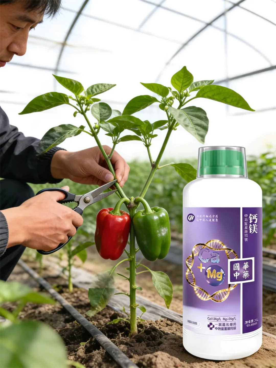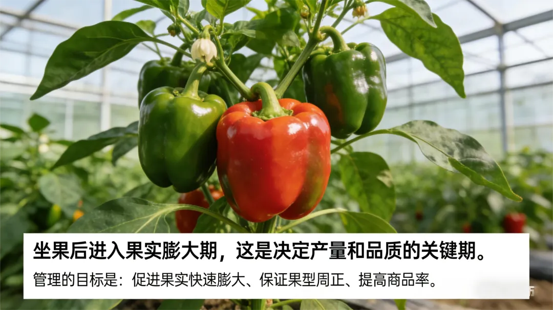营养充足均衡的植株,自然坐果率就高。这个时期要特别注意磷钾钙的补充。磷能促进花芽分化、提高花粉质量;钾能促进碳水化合物运输、提高坐果率;钙能促进细胞分裂、预防生理病害。可以叶面喷施 芸闪素 ,促进花芽分化、提高坐果率。芸闪素是专门针对膨果着色、提质增产研发的中药肥。它基于作物养分需求规律,融合中医理论与生物原理,通过中药生物技术萃取而成。特别添加螯合态微量元素,活性强、吸收快、利用率高,兼顾速效补给与长效滋养。使用后能精准补充作物关键营养,快速激活酶活性、提升光合作用效率,加速养分向果实输送。同时增加叶绿素含量、促进蛋白质合成,从而改善作物生长平衡,加快细胞分裂,助力花芽分化更充分,提高坐果率,让果实膨大更均匀、果型更周正。使用方法 :稀释600-800倍液,从现蕾期开始喷施,间隔7-10天喷一次,连喷2-3次。既可以单独使用,也可以和杀菌剂、杀虫剂混用,相互增效。同时要持续冲施 中药氨基酸钙镁肥 ,每隔10-15天冲施一次,每亩3公斤。既能提供充足的营养,又能增强植株抗病能力,一举多得。一般情况下,门椒和对椒要及时摘除。但如果植株生长特别旺盛,有徒长趋势,可以保留门椒,利用果实生长消耗养分,控制营养生长。如果植株长势弱,门椒和对椒一定要摘除,让养分集中供应后期果实,保证产量。彩椒开花多,如果全部坐果,养分供应不上,果实品质下降。要适当疏花疏果,每个结果枝保留2-3个果即可。疏除的对象是:畸形花果、病虫害花果、发育不良的小花小果、过密的花果。保留果型周正、发育良好、大小均匀的果实。疏花疏果要及时,越早越好。早期疏除,消耗养分少,对植株影响小。坐果后进入果实膨大期,这是决定产量和品质的关键期。管理的目标是:促进果实快速膨大、保证果型周正、提高商品率。浇水 :保持土壤湿润,但不要过湿。一般5-7天浇一次水,采用滴灌最好。浇水时间选择晴天上午,浇后及时通风降湿。追肥 :每10-15天追肥一次,每次每亩冲施 中药氨基酸钙镁肥 3-4公斤。这个时期钾的需求量最大,要增加钾肥用量。同时要配合叶面喷施。 中药氨基酸钙镁肥 稀释600-750倍液,间隔7-10天喷一次。叶面补充见效快,对提高果实品质作用明显。芸闪素 也要持续喷施,稀释600-800倍液,间隔7-10天喷一次。芸闪素能加速色素沉淀,使果色鲜亮诱人,显著提升外观品质。还能加速细胞分裂,促进果实均匀膨大,改善果型。同时通过温和调理作物生长状态,减少农药依赖,降低农残积累,让果实更绿色安全。果实膨大期白天保持25-30℃,夜间15-20℃。温度过高或过低都影响果实发育。这个时期要注意防止高温和低温障碍。夏季高温时要加强通风、遮阳降温;冬季低温时要注意保温、增温。充足的光照是果实膨大和品质提升的保证。要保持棚膜清洁,提高透光率。及时整枝打叶,改善群体光照条件。冬春季节如果遇到连续阴天,要想办法补光。可以安装LED补光灯,每天补光4-6小时。- 打叶 :及时打掉下部老叶、黄叶、病叶,改善通风透光。一般从第一穗果采收后开始打叶,逐渐把果实以下的叶片打掉。打叶不要一次打太多,每次打3-5片。