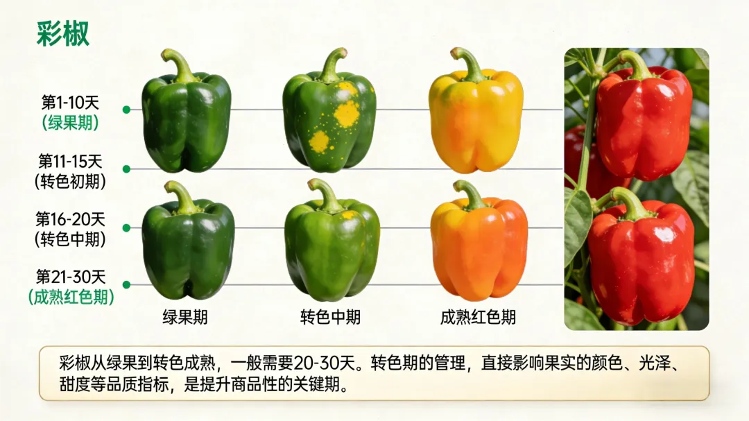 果实膨大期要重点防治疫病、炭疽病、白粉病等病害,以及烟青虫、棉铃虫等虫害。甄中医急救包 对这些病害防效特别好。这个产品由锌杉碳、多酶铜、炭靶褐、芸闪素四大成分科学配比而成,借鉴中医"标本兼治"理念。锌杉碳 来源于日本冷杉,对高等真菌和低等真菌都有很好的防治效果。它采用超临界中药萃取技术,特别添加雷公藤、大青叶、百部、苦楠、黄芪、地龙等多味中药材。治疗真菌病害的原理包括:干扰真菌代谢、破坏真菌细胞壁和细胞膜、调节植物免疫、抑制真菌孢子萌发、竞争营养和空间等多个方面。多酶铜 是酶解铜,对细菌性病害效果很好。它是公司研发的单一微量元素多酶催化铜,采用生物高分子与铜离子充分结合。喷施后在植物表面形成严密保护药膜,与植物亲和力强,耐雨水冲刷,药膜缓慢释放铜离子发挥效果。而且多酶铜添加了10几种生物酶,能催化铜离子的杀菌效果。同时添加了苦楝、烟叶碱等中药成分,不会像传统铜制剂那样刺激红蜘蛛爆发,反而具有驱赶红蜘蛛的功效。炭靶褐 根据免疫学机制,以诱导作物产生抗性为作用机理。施用后作物迅速吸收,活化抗性基因并诱导作物产生抗性物质,溶解有害菌的细胞壁,破坏有害菌的生长点,抑制有害菌繁殖。内吸性强,能通过表皮渗透至组织内部,防治结合,减少病害复发。芸闪素 作为天然植物生长调节剂,除了促进生长,还能缓解因病害导致的生长停滞,缩短恢复期,确保作物在防病的同时不耽误生长周期。四大成分科学配比,不是简单混合,而是通过科学配比让它们相互增效:锌杉碳快速抑制病原菌,为作物争取"治疗时间";多酶铜精准打击细菌,防止复合感染;炭靶褐修复受损组织,增强作物体质;芸闪素调节生长,促进健康恢复,提高产量。四者协同,形成"抑菌—修复—促生"的完整链条,达到"治病+养地+增产"的三重效果。防治范围 包括:溃疡病、青枯病、蔓枯病、立枯病、根腐病、软腐病、叶斑病、疮痂病、枯黄萎病、叶枯病、靶斑病、霜霉病、灰霉病、猝倒病、白粉病、炭疽病、斑点病、黑胫病、茎基腐、角斑病、细菌性穿孔病、流胶病、锈病、叶霉病、黑星病、菌核病、早晚疫病、枯萎病等。使用方法 :发病初期,用甄中医急救包全套(四个成分)按推荐倍数稀释后喷雾,叶片正反面均匀喷施。间隔7-10天再喷一次。如果病情严重,缩短间隔期到5-7天,连喷2-3次。锌杉碳和多酶铜联合使用有特殊优势:增强杀菌效力、提高防治广谱性、促进植物生长与健康、减少农药残留风险、延缓抗药性产生。两者配合,对疫病、炭疽病、白粉病等真菌病害的防效能达到85%以上,对青枯病、软腐病等细菌病害也有很好的效果。烟青虫和棉铃虫要及时防治。幼虫蛀入果实内部取食,造成果实腐烂,损失很大。可以用甲维盐、氯虫苯甲酰胺等药剂防治,间隔7-10天喷一次。彩椒从绿果到转色成熟,一般需要20-30天。转色期的管理,直接影响果实的颜色、光泽、甜度等品质指标,是提升商品性的关键期。转色期要求温度稍低,白天22-25℃,夜间13-18℃。温差大有利于糖分积累和色素形成。昼夜温差保持在10-15℃最好。温差太小,果实转色慢、颜色浅、甜度低。但也不能过低,夜温低于10℃会影响转色速度。光照对转色至关重要。光照充足时,果实颜色鲜艳、均匀、有光泽。光照不足时,果实颜色暗淡、不均匀、无光泽。要保持棚膜清洁,及时清理膜上的灰尘和杂物,提高透光率。打掉遮挡果实的老叶,让果实充分见光。但不要把果实周围的叶片全部打掉,适当遮阴能防止日灼。转色期要控制氮肥,增加钾肥。氮肥过多会导致着色不良、果实发软。钾能促进糖分积累、改善果实品质、增加硬度、提高耐储运性。每10-15天冲施一次 中药氨基酸钙镁肥 ,每亩3公斤。同时叶面喷施,稀释600-750倍液,间隔7-10天喷一次。持续喷施 芸闪素 非常重要。芸闪素能加速色素沉淀,使果色鲜亮诱人。促进糖分积累,提高口感。增强果实硬度,提高耐储运性。而且能增强作物抗逆能力,保持健康长势。转色期稀释600-800倍液,间隔7天喷一次,连喷2-3次。很多种植户反映,用了芸闪素的彩椒,颜色特别鲜艳,果面光泽度好,甜度明显提高,卖相好价格也高。水分管理要均衡。忽干忽湿容易裂果,长期干旱影响转色和果实膨大。保持土壤湿润,采用滴灌最好。转色期有时会发生落果现象,主要原因是养分供应不足、温度不适、病虫害侵染等。要保证充足的肥水供应,维持适宜的温度,加强病虫害防治。如果植株挂果太多,要适当疏果,避免坠秧和落果。彩椒转色有个特点,就是同一株上的果实转色时间不一样。要分级采收,转色到位的先采,没转色的继续留在株上。不同颜色的彩椒,转色标准不一样。红椒要达到90%以上转红,黄椒要达到85%以上转黄,才能采收。如果采收过早,颜色不够鲜艳,卖不上价。本地市场、近距离运输 :可以等到完全转色、果实稍微发软时采收。这时候甜度最高、口感最好。外销、长途运输 :要在果实刚转色、还有一定硬度时采收。八九成转色即可,这样耐储运,运到目的地后继续后熟。从开花到绿熟果大概需要35-40天,从绿熟果到转色成熟需要20-30天,总共60-70天。采收时间选择早晨或傍晚,避开中午高温时段。高温时采收,果实温度高、呼吸作用强,不耐储运。用剪刀剪断果柄,不要用手硬拽。硬拽容易伤到植株,也容易把果柄拉断,留