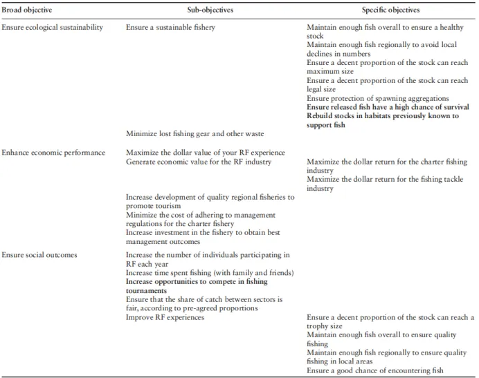 通过开展在线专家研讨会,为新南威尔士州三种重要休闲鱼种系统识别并梳理出可用于制定收获策略的管理目标。研讨会在参考一份通用目标清单的基础上,通过分组讨论和全体审议,最终为每个鱼种总结了管理目标(表1)。这些目标涵盖了生态可持续性、经济效益和社会体验三大支柱,并按照层级结构整理,为后续在全州垂钓者中进行偏好排序调查奠定了核心基础。