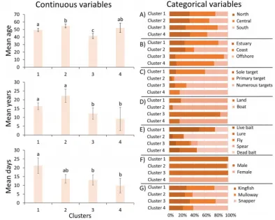 分析结果描绘了四个截然不同的垂钓者特征。在图3中体现为四个具有显著差异的集群:集群1 被刻画为“高投入专一者”,特征是年钓鱼天数最多、以目标鱼种为主且偏爱使用活饵;集群2 是“经验丰富的离岸钓手”,特征为年龄最长、钓鱼经验最丰富,并显著倾向于在离岸作业;集群3 是“年轻的岸钓爱好者”,成员最年轻,且主要从岸上钓鱼;集群4 则全部由女性组成,其钓鱼经验和活跃度相对较低。单因素方差分析证实了这些集群在绝大多数特征上存在显著差异(P<0.05),标明了哪些集群间在连续变量或分类变量上存在显著差异。同时,结果表明:所有三个目标鱼种都均匀地分布在四个集群中,这说明集群的划分并非基于鱼种偏好,而是基于操作特征与人口模式。