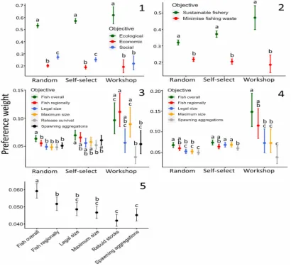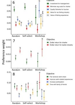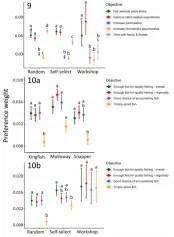 此外,图表进一步揭示了各类别内部的优先序:在生态目标中(图4),“保持足够总体资源量”最受重视;在经济目标中(图5),垂钓者更看重渔具产业而非包船业的回报;在社会目标中(图6),“确保渔获份额公平”权重最高,而追求“战利品级别的鱼”则最低。综上所述,这部分结果有力地证明,新南威尔士州休闲垂钓者的管理目标偏好存在一个跨越不同鱼种和受访者来源的、清晰且共识性的核心层级体系。