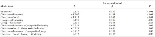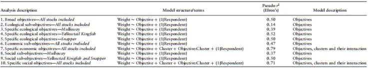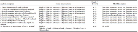 表2 目标、资源群体与受访群体间偏好权重的GLMM最优模型汇总