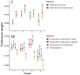 基于不同钓鱼操作与人口特征所划分的四个垂钓者集群,在绝大多数情况下,对渔业管理目标的偏好差异并不显著。在表4的模型选择结果中,对于研究涵盖的大多数目标层级,最优统计模型仅包含“目标”本身,而未纳入“集群”或其交互项,说明四个集群在这些方面的偏好模式在统计上无法区分。但是,研究也识别出两个重要的例外,在这两种情况下,集群间的交互效应变得显著,体现在图7中:一是在具体经济目标上,集群1和2更看重“最大化渔具产业回报”而非“包船业回报”,而集群3和4对两者无差异;二是在具体社会目标上,集群4对所有目标的评价相对平均,而其他集群则普遍给予“确保鱼群能达到战利品规格”这一目标最低的权重。