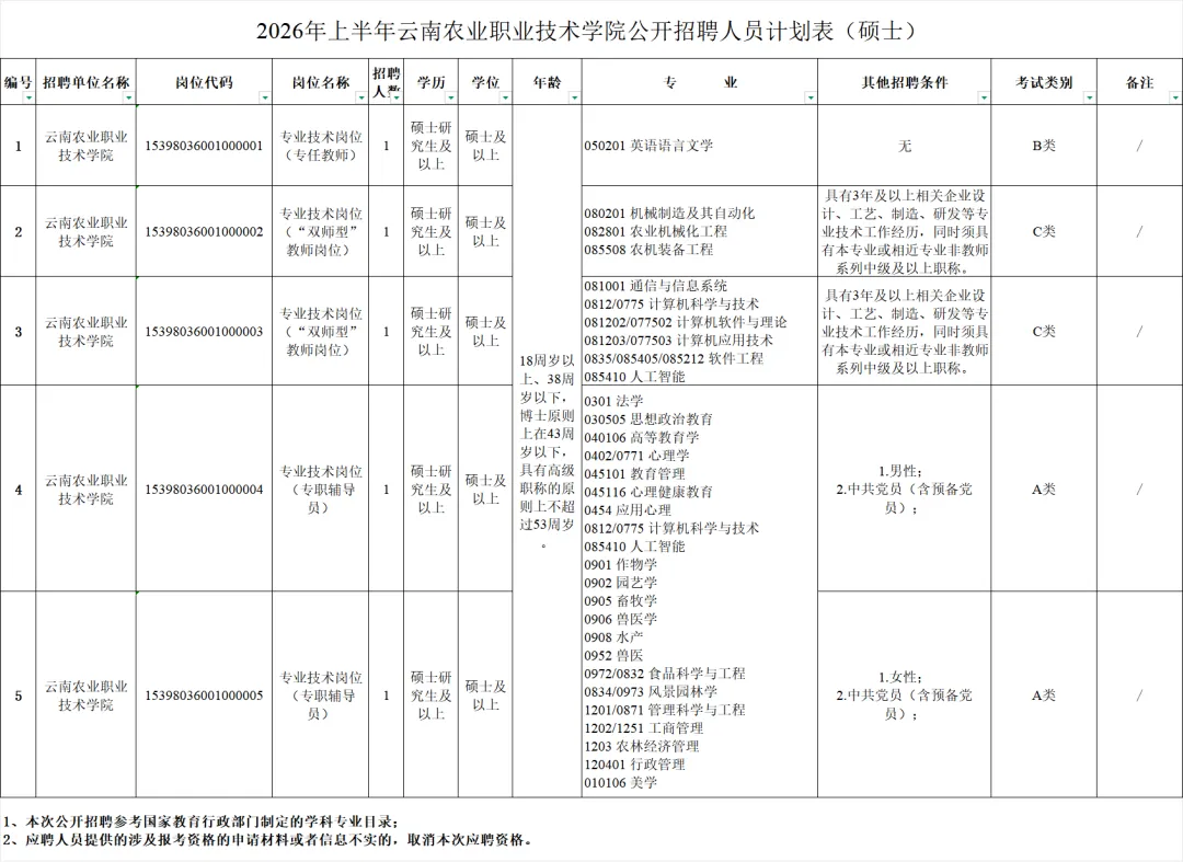 3.具备招聘岗位所需的专业或任职资格、职业(执业)资格及技能要求;1.报名时间:2月2日9:00至2月6日18:002.报名方式:登录云南农业职业技术学院(网址:https://www.ynavc.com/)→进入报名界面,按报名系统提示填写注册信息→上传近期清晰免冠电子照片(禁止使用美颜、滤镜等功能拍照上传)→填写报名信息→仔细核对报名信息并确认后提交审核→等待审核→审核通过后网上缴费→缴费成功后在规定时间内打印准考证。注:电子证件照为JPG或JPEG格式,照片宽度不能小于295像素,高度不能小于413像素,蓝底或白底均可。1.笔试。本次笔试参照《事业单位公开招聘分类考试公共科目笔试考试大纲(2026年版)》(附件2),考试分为3个类别(按实际考试类别确定):综合管理类(A类)、社会科学专技类(B类)、自然科学专技类(C类),每个类别分别进行《职业能力倾向测验》和《综合应用能力》考试。《职业能力倾向测验》考试时限为90分钟,满分为150分,《综合应用能力》考试时限为120分钟,满分为150分。笔试具体考试地点、考场安排以准考证上的要求为准,应聘人员须凭准考证和身份证原件按规定时间到指定考场参加笔试。2.面试。面试主要考察应聘人员专业技能及适应岗位要求的业务素质与工作能力等。面试时间、地点等事宜将另行公告通知,请应聘人员关注云南农业职业技术学院门户网站,保持电话畅通。1.考察。由云南农业职业技术学院组织开展考察工作,采取实地考察或信函考察等方式,考察内容主要包括政治素质、道德品行、能力素质、心理素质、学习和工作表现、遵纪守法、廉洁自律、教职工准入查询等情况。同时核实考察对象是否符合应聘岗位资格条件、提供的应聘信息和相关材料是否真实准确等情况。2.体检。考察合格的应聘人员参加体检。由云南农业职业技术学院组织应聘人员到指定医院进行体检,体检费用由参加体检人员自理。体检项目和标准按照《公务员录用体检通用标准(试行)》及操作手册执行。3.公示。由云南农业职业技术学院根据考察、体检结果确定拟聘用人员,拟聘用人员名单在省人力资源社会保障厅门户网站(网址:http://hrss.yn.gov.cn/)和云南农业职业技术学院门户网站(网址:https://www.ynavc.com/)面向社会公示,公示期为5个工作日。本次公开招聘人员纳入事业单位编内人员管理,执行国家和我省事业单位在职在编工作人员工资有关政策规定。