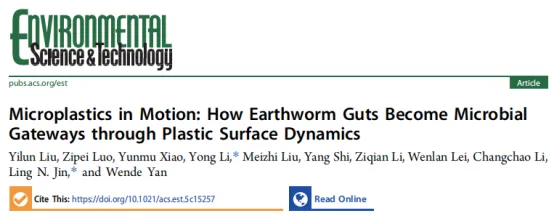 在土壤食物网中,蚯蚓等土壤动物会持续摄食并排出微塑料颗粒,使其在“消化—排泄”循环中不断经历表面重塑与微生物重组。团队利用仿生蚯蚓肠道模型,系统解析聚对苯二甲酸乙二醇酯(PET)和聚苯乙烯(PS)两类典型微塑料在肠道环境中与肠源微生物的相互作用机制。研究结果以“Microplastics in Motion: How Earthworm Guts Become Microbial Gateways through Plastic Surface Dynamics”为题,2025年12月发表在环境领域顶刊Environmental Science & Technology上。李永教授、金灵教授(香港理工大学)为本文通讯作者,硕士研究生刘轶伦为第一作者。