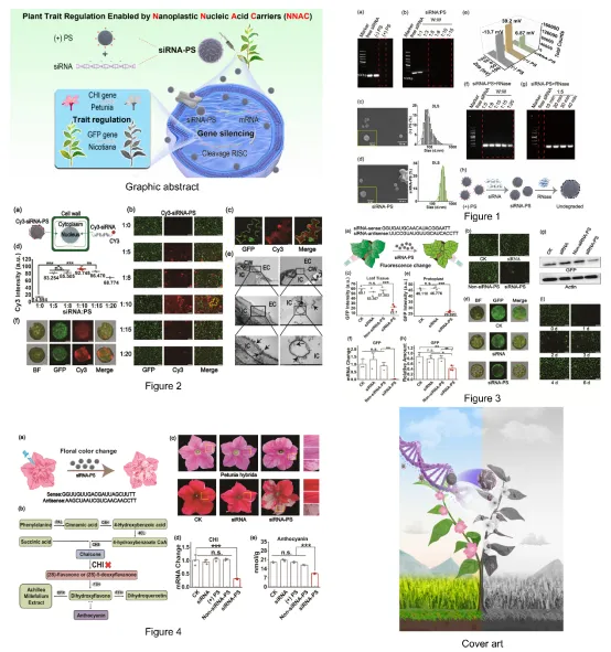 本研究采用RNA干扰(RNAi)技术,系统评估了纳米塑料作为核酸载体(NNAC)在植物性状调控中的应用。结果表明,带正电的聚苯乙烯纳米塑料(PS-NPs)可通过静电作用高效吸附小干扰RNA(siRNA),形成酶解稳定的siRNA-PS复合物。进一步实验显示,靶向siRNA-PS复合物可显著抑制烟草叶片中绿色荧光蛋白(GFP)的荧光信号,并使矮牵牛花花瓣颜色明显褪色,处理24小时后GFP与CHI基因表达量分别下降97.6%和69.4%。然而,在烟草中GFP表达在4天后基本恢复至对照组水平,表明该调控行为具有瞬时性与可逆性,属于非遗传性干预。此研究阐明了纳米塑料作为功能性核酸递送载体的潜力,不仅深化了对纳米塑料生物效应与安全性的认识,也为评估纳米污染物在植物中的毒理机制提供了理论依据。