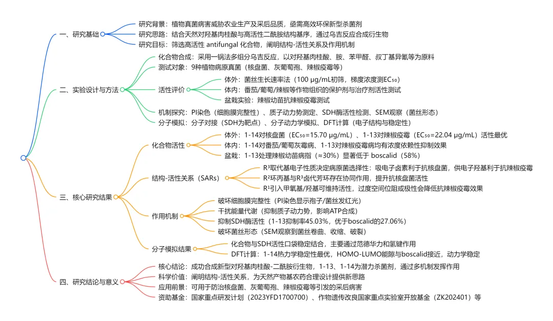 植物真菌病害对农业生产及采后农产品质量安全构成严重威胁,因此开发高效环保的新型杀菌剂具有重要意义。本研究将天然来源的对羟基肉桂酸与高活性二酰胺结构基序相结合,设计并合成了一系列新型对羟基肉桂酸 - 二酰胺衍生物。体外抗真菌活性筛选显示,多个化合物对多种植物病原真菌具有显著抑制效果,其中化合物 1-14 对核盘菌(EC₅₀=15.70 μg/mL)、化合物 1-13 对辣椒疫霉(EC₅₀=22.04 μg/mL)表现出优异活性。化合物 1-13 在辣椒叶片和果实上对辣椒疫霉展现出显著的体内抗真菌活性,化合物 1-14 对番茄和阳光玫瑰葡萄上的灰葡萄孢则呈现明显的浓度依赖性抑制作用。通过体内活性测定、碘化丙啶(PI)染色、质子动力势(PMF)评估、琥珀酸脱氢酶(SDH)活性检测及扫描电子显微镜(SEM)观察等进一步研究表明,目标化合物通过多种机制发挥抗真菌作用,包括破坏细胞膜完整性、干扰能量代谢及抑制 SDH 酶活性。分子对接和分子动力学模拟揭示了化合物与 SDH 活性口袋的稳定结合模式,密度泛函理论(DFT)计算进一步验证了其电子结构与稳定性。本研究为开发新型植物源杀菌剂提供了有价值的候选分子和理论依据,不仅为防治核盘菌、辣椒疫霉等病原菌引发的采后病害提供了高活性候选化合物,所阐明的结构 - 活性关系及多重作用机制也为天然产物基农药的合理设计提供了新思路。