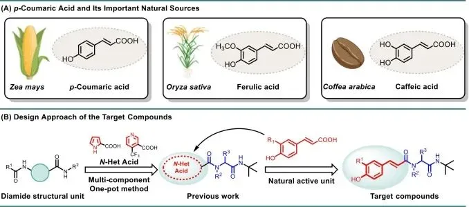 图 1:目标化合物的设计思路。(A) 对香豆酸及其重要天然来源;(B) 目标化合物的设计路线