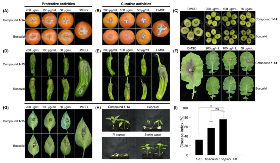 图 3:体内活性测试。(A) 化合物 1–14 和啶酰菌胺对番茄灰葡萄孢的保护作用;(B) 化合物 1–14 和啶酰菌胺对番茄灰葡萄孢的治疗作用;(C) 化合物 1–14 和啶酰菌胺对阳光玫瑰葡萄灰葡萄孢的防治效果;(D) 化合物 1–13 和啶酰菌胺对辣椒果实辣椒疫霉的保护作用;(E) 化合物 1–13 和啶酰菌胺对辣椒果实辣椒疫霉的治疗作用;(F) 化合物 1–14 和啶酰菌胺对油菜核盘菌的防治效果;(G) 化合物 1–13 和啶酰菌胺对辣椒叶片辣椒疫霉的防治效果;(H) 化合物 1–13 和啶酰菌胺对辣椒幼苗辣椒疫霉的防治效果;(I) 辣椒幼苗的病情指数(“*” 表示差异显著(P<0.05),“ns” 表示无显著差异)