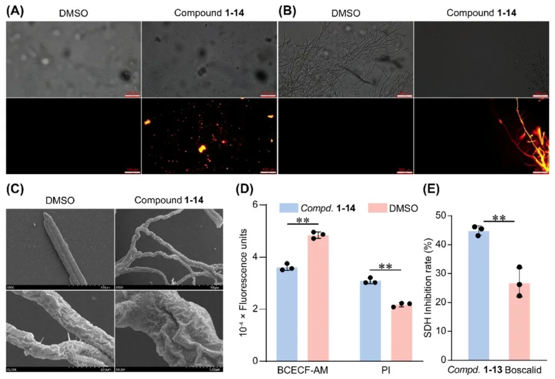 图 4:抗真菌作用机制阐明。(A) 化合物 1–14 和二甲基亚砜(空白对照)处理后的孢子碘化丙啶(PI)染色图;(B) 化合物 1–14 和二甲基亚砜(空白对照)处理后的菌丝碘化丙啶(PI)染色图;(C) 化合物 1–14(50 µg/mL)和二甲基亚砜(空白对照)处理后核盘菌菌丝的扫描电子显微镜(SEM)分析;(D) 质子动力势和碘化丙啶(PI)染色的荧光强度;(E) 化合物 1–13 和啶酰菌胺对琥珀酸脱氢酶(SDH)的抑制率