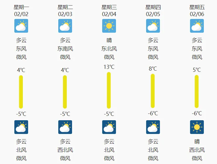 预计未来三天喀什各地晴间多云,南部山区断续有微到小雪,局地中雪,风力不大,气温上升。未来三天平原城区最高气温10℃左右,最低气温-13℃左右。