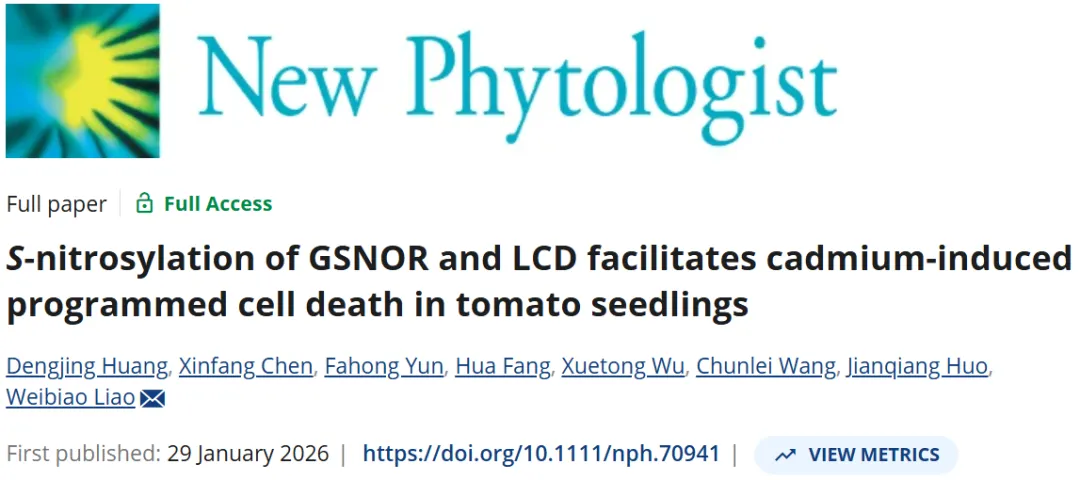 近日,甘肃农业大学廖伟彪教授团队在New Phytologist 发表了题为“S-nitrosylation of GSNOR and LCD facilitates cadmium-induced programmed cell death in tomato seedlings” 的研究成果,揭示了一氧化氮(NO)和硫化氢(H₂S)通过其关键代谢酶S-亚硝基谷胱甘肽还原酶(GSNOR)和L-半胱氨酸脱巯基酶(LCD)的相互作用及翻译后修饰协同调控镉(Cd)胁迫诱导番茄程序性细胞死亡(PCD)的分子机制。