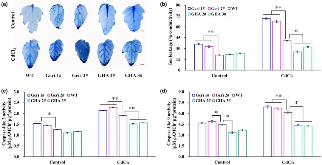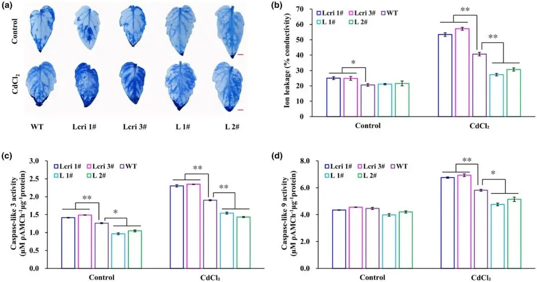 参与 NO 和 H₂S 代谢的关键酶 GSNOR 和 LCD 也被证实是植物响应镉(Cd)胁迫的重要调控因子。通过 CRISPR-Cas9 技术构建的基因敲除材料发现,GSNOR(负调控 NO 水平)和 LCD(催化 H₂S 生成)的缺失均显著降低了番茄对 Cd 胁迫的耐受性。与野生型相比,敲除植株在 Cd 处理下表现出更严重的细胞死亡表型,并伴随着多种程序性细胞死亡(PCD)相关基因的显著上调(图 2,图3),表明 GSNOR 和 LCD 通过维持 NO/H₂S 信号稳态在 Cd 胁迫耐受性中发挥关键作用。