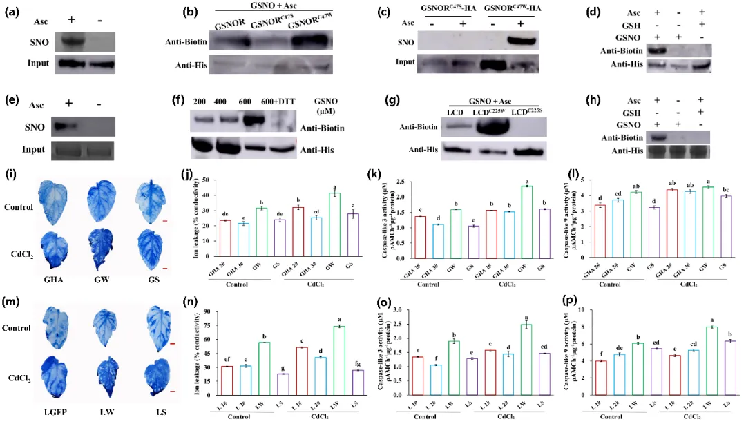 图4. GSNOR 和 LCD 分别在Cys47和Cys225位点的S-亚硝基化修饰加剧镉诱导的PCD